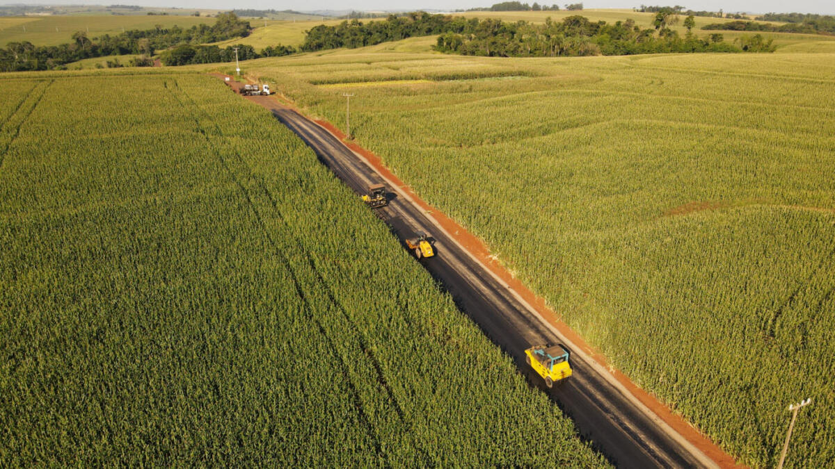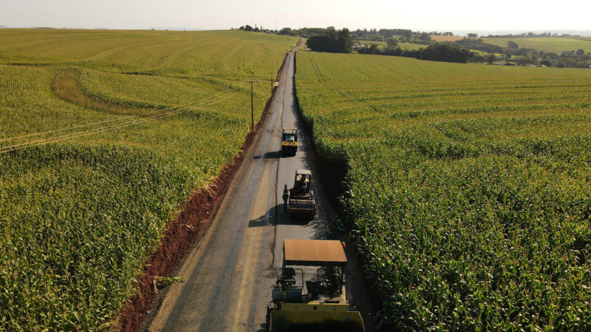 Trecho da estrada rural (pavimentada com pedras irregulares) que liga a sede do distrito de São Roque até a linha Cinco Cantos, no interior de Marechal Cândido Rondon, está recebendo asfaltamento. No projeto, essa etapa é denominada de trecho 2, uma vez que uma parte da estrada já foi asfaltada.