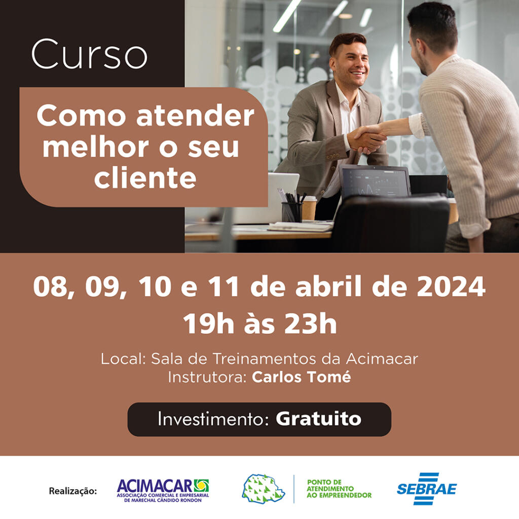 Com foco em atender as exigências do público consumidor, apresentando diferenciais no atendimento e utilizando um conjunto de ações para cativar e fidelizar clientes, a Associação Comercial e Empresarial de Marechal Cândido Rondon (Acimacar) promove o treinamento gratuito “Como atender melhor o seu cliente”.
