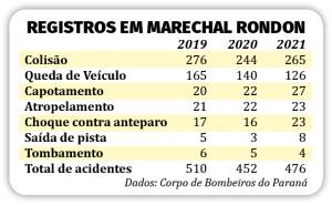As colisões seguem liderando o ranking de atendimentos dos bombeiros em Marechal Rondon, com 265 registros em 2021, 244 em 2020 e 276 em 2019. Na sequência estão os registros de queda de veículo, com 126 atendimentos.