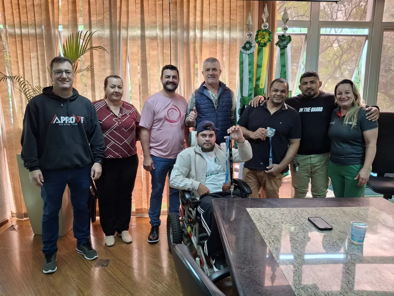 Na manhã desta quinta-feira (9), atletas rondonenses de diversas modalidades, acompanhados de suas comissões técnicas e de representantes de entidades ligadas ao esporte, foram recebidos no paço municipal pelo prefeito Adriano Backes, pelo secretário de Esporte e Lazer, Claudinei Lopes Mainardes, além de outros secretários e servidores públicos.