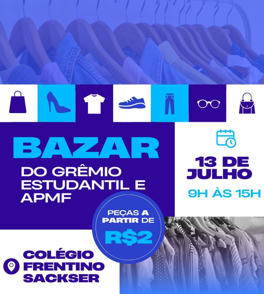 “Neste sábado (13) acontecerá o segundo bazar do Colégio Frentino Sackser, com valores serão a partir de dois reais. Esse bazar é uma promoção do grêmio estudantil juntamente com a APMF do colégio. O horário será das 9 às 15 horas, sem fechar ao meio-dia”, explica Beatriz Helena Morais, presidente do grêmio estudantil.