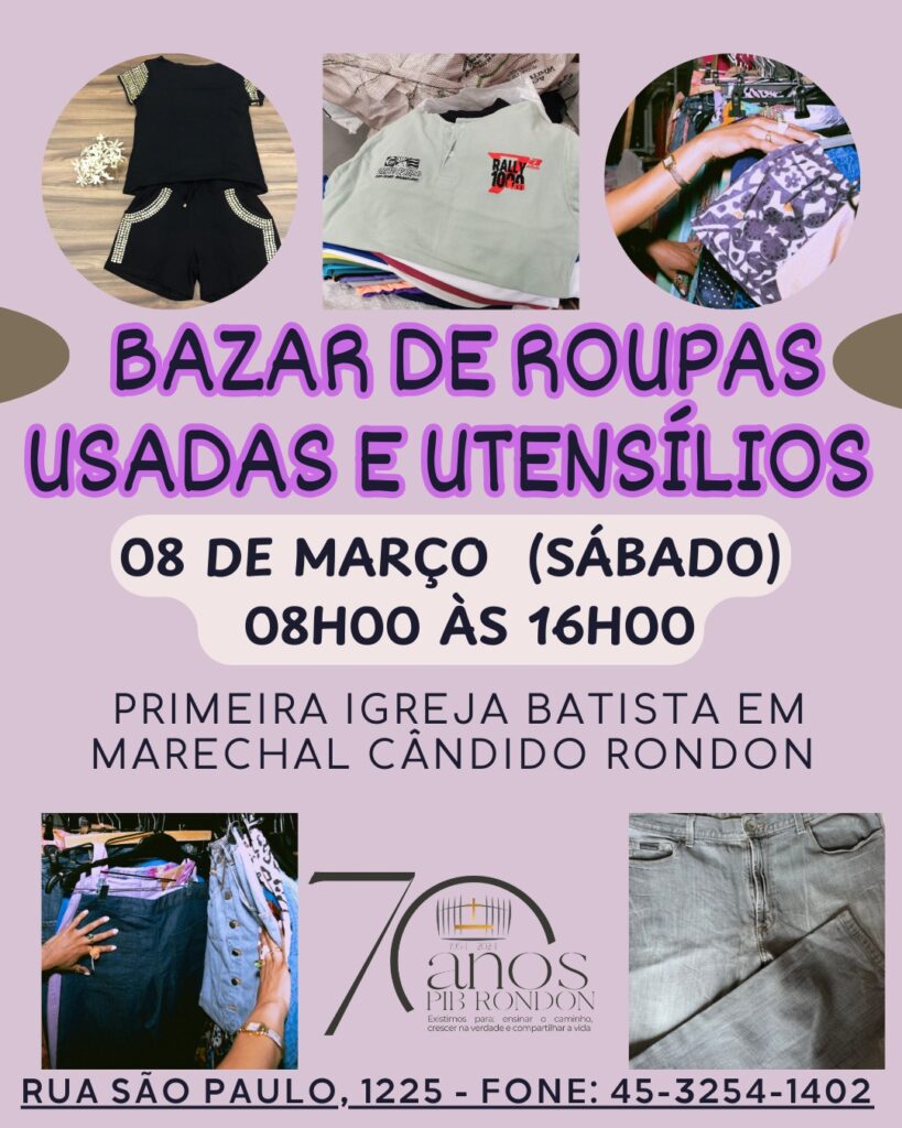 A Primeira Igreja Batista em Marechal Cândido Rondon, localizada na Rua São Paulo, nº 1225, próximo à Praça das Igrejas, realiza neste sábado (8), das 8 as 16 horas, o seu tradicional Bazar dos Poucos Reais.