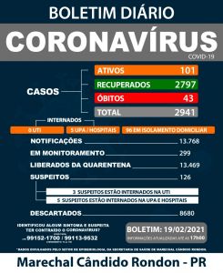 Mais 12 casos de Covid-19 foram apontados a Marechal Cândido Rondon, segundo boletim divulgado às 17 horas desta sexta-feira (19) pelo Setor de Epidemiologia da Secretaria Municipal de Saúde. Com isso, o município avança a 2.941 testes positivos; ontem (18) eram 2.929 os casos registrados da doença.