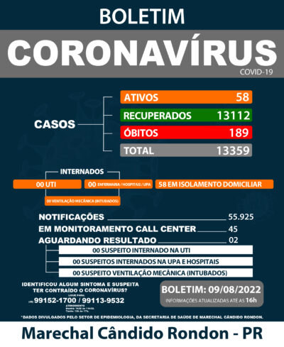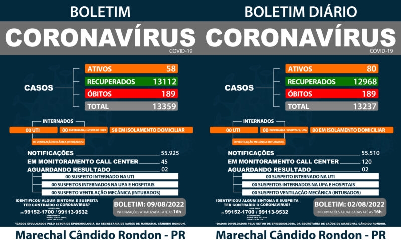 Marechal Cândido Rondon registrou 122 novos casos de Covid-19 na última semana, conforme aponta o boletim atualizado nesta terça-feira (9) pelo Setor de Epidemiologia da Secretaria de Saúde.