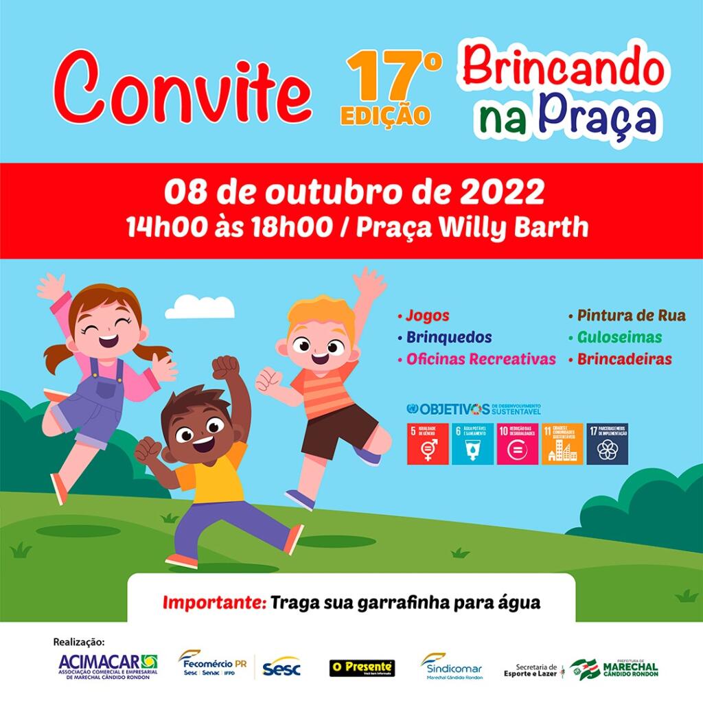 Em alusão ao Dia das Crianças, acontece neste sábado (8), na Praça Willy Barth, em Marechal Cândido Rondon, a 17ª edição do Brincando na Praça.
