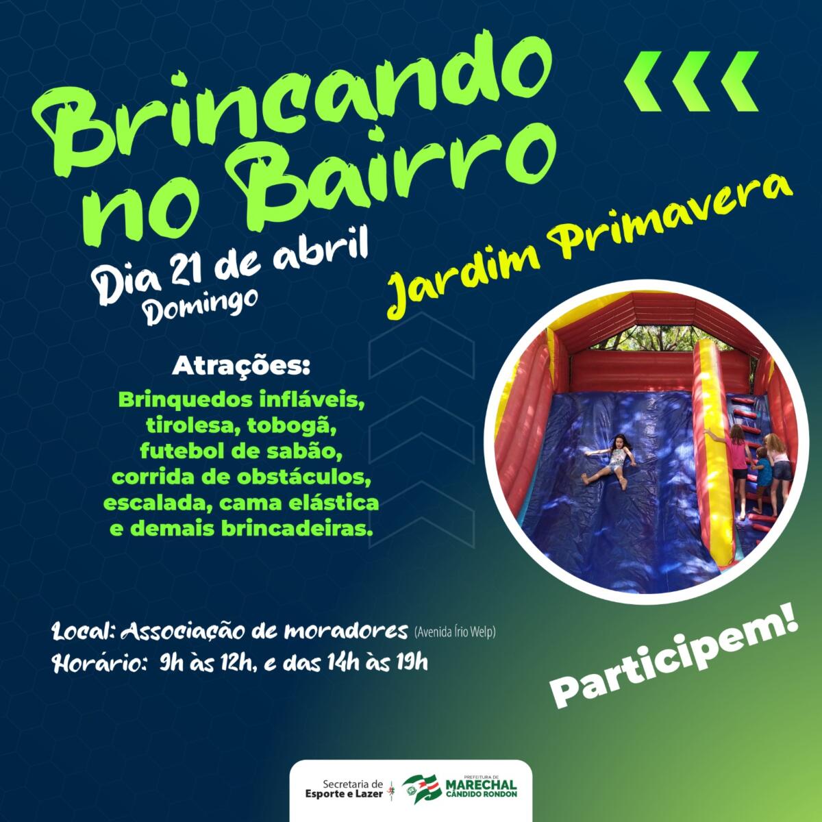 Crianças, jovens e famílias que residem no bairro Primavera, em Marechal Cândido Rondon, terão uma programação especial no domingo (21). Trata-se do Brincando no Bairro, que ocorrerá na associação de moradores, das 9 às 12 horas e das 14 às 19 horas, com atividades gratuitas.