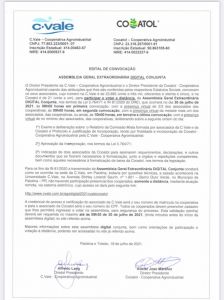 Além do exame e deliberação sobre o relatório da comissão mista formada por associados e justificação da incorporação, tendo por finalidade incorporar a Cooatol à C.Vale, a ordem do dia também terá a indicação de dois associados da Cooatol para assinarem requerimentos, declarações e outros documentos que fizerem necessários à formalização da baixa da Cooatol, nos termos da legislação.