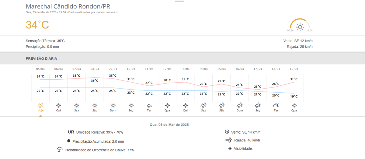 A quarta-feira (5) começou com temperaturas na casa dos 25°C em Marechal Cândido Rondon. A previsão do tempo para hoje é de máxima de 34°C no município, segundo o Sistema de Tecnologia e Monitoramento Ambiental do Paraná (Simepar).