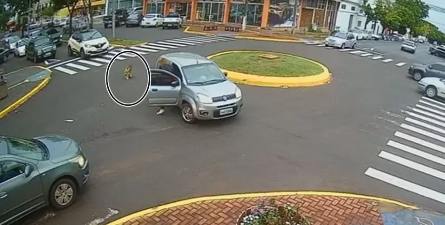 Nas imagens é possível ver que o carro seguia na Rua Mem de Sá, vindo da Minas Gerais, realizou a rotatória para seguir a sua esquerda na Avenida Rio Grande do Sul, quando a porta do carro se abre e uma criança cai no asfalto.