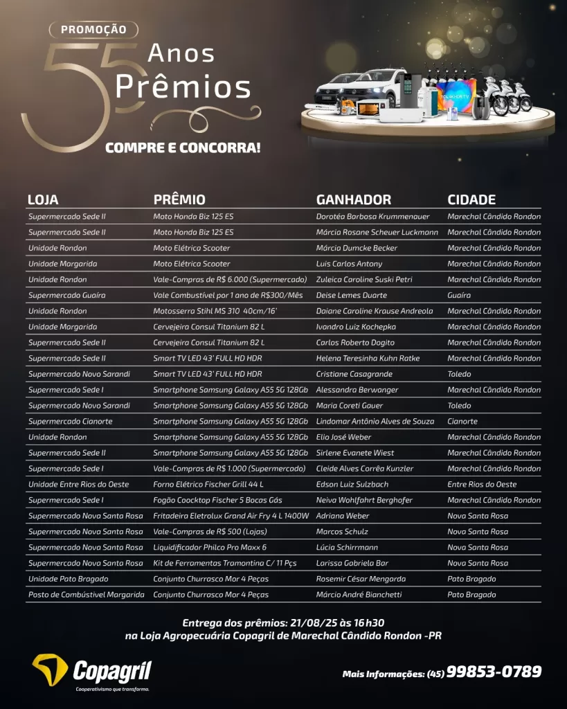 A entrega oficial dos prêmios está prevista para o dia 21 de agosto, às 16h30, na Loja Agropecuária Copagril, em um evento que reunirá os contemplados, diretoria e convidados. Para confirmar a participação do premiado na entrega oficial, o mesmo pode ligar para o número: 04599853-0789.