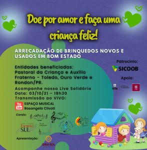 O Espaço Musical Rosangela Clivati, de Toledo, realiza no próximo dia 03 a live solidária “Doe por amor e faça uma criança feliz” em prol da Pastoral da Criança e Auxílio Fraterno de Toledo e de Ouro Verde do Oeste e da Casa de Maria de Marechal Cândido Rondon. O objetivo é arrecadar brinquedos novos e usados em bom estado. A live será realizada a partir das 18h30, pelo canal no YouTube do Espaço Musical Rosangela Clivati. O evento tem como patrocinador o Sicoob Meridional Toledo e apoiadores o Teatro Municipal de Toledo e a PUC/Toledo.