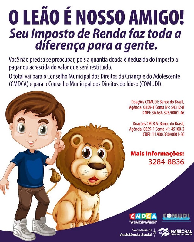 Os cidadãos interessados em ser solidários para com as crianças e os idosos de Marechal Cândido Rondon podem destinar parte do Imposto de Renda para que os recursos sejam utilizados em projetos voltados ao atendimento aos dois públicos. A campanha é realizada pela Secretaria Municipal de Assistência Social, com o apoio do CMDCA (Conselho Municipal dos Direitos da Criança e do Adolescente) e do COMUDI (Conselho Municipal dos Idosos).