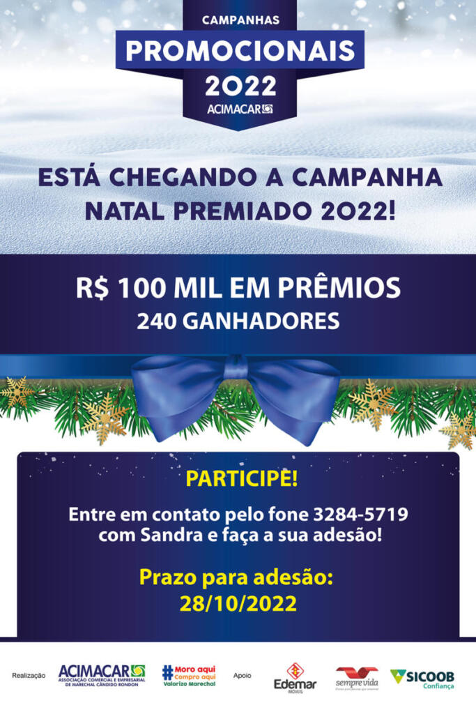 O prazo para adesão à campanha Natal Premiado segue até 28 de outubro. Para mais informações e detalhes sobre como fazer parte da campanha, basta entrar em contato com Sandra pelo telefone (45) 3284-5719.