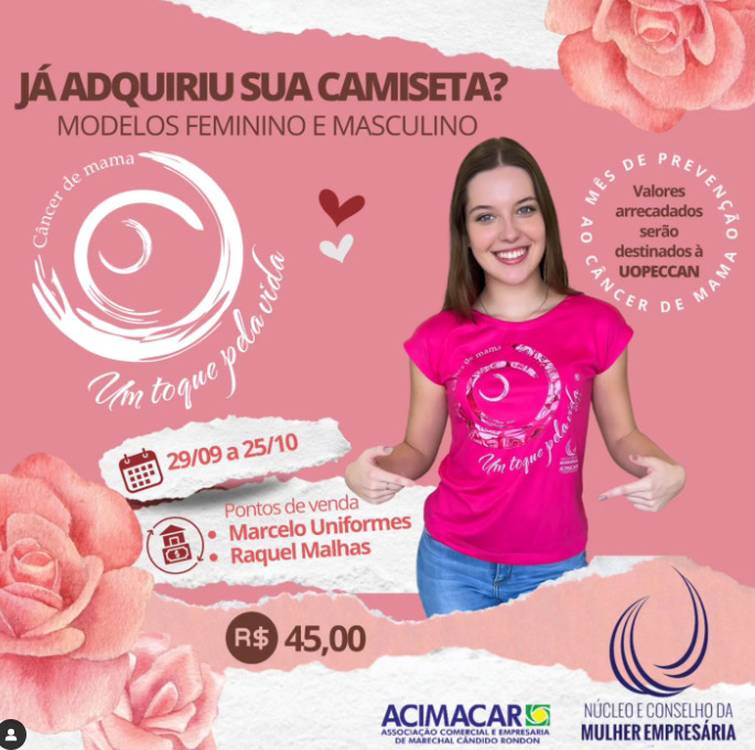 A presidente do Conselho da Mulher pediu o apoio de todos os rondonenses na compra de camisetas da campanha, que podem ser adquiridas na Raquel Malhas e na Marcelo Uniformes, a R$ 45. O valor arrecadado com as vendas é destinado à Uopeccan.