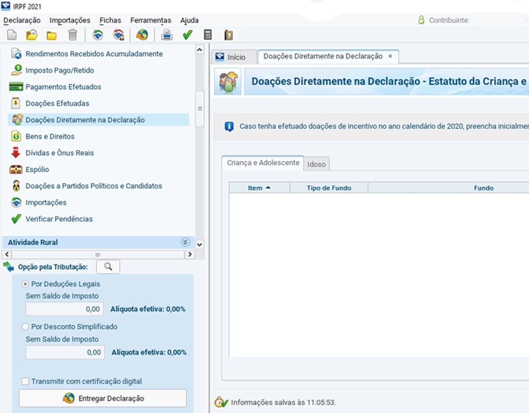 Para realizar a doação é muito simples. No programa IRPF 2021, basta clicar em “Doações Diretamente na Declaração” e escolher o Fundo Municipal da Criança e do Adolescente. Estando a declaração preenchida, o programa calcula os valores disponíveis. Posteriormente basta imprimir os DARFs em: Declaração; Imprimir; DARF – Doação Diretamente da Declaração – ECA.