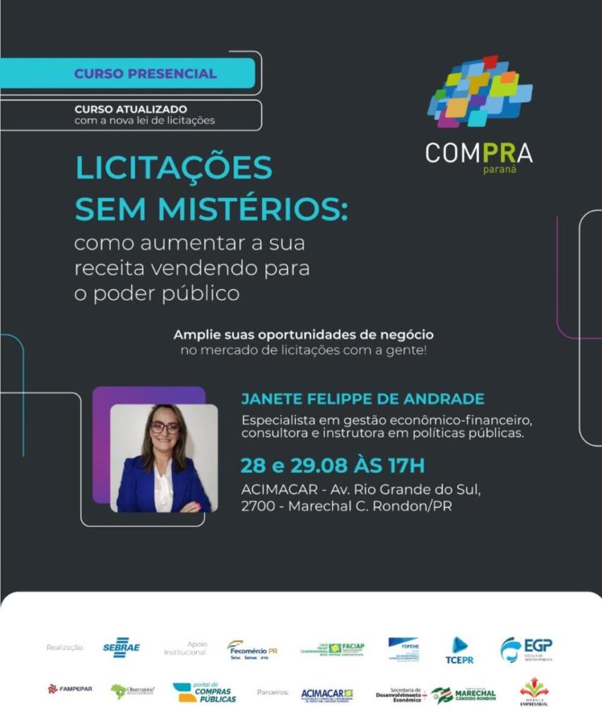 A capacitação, que já atende à nova lei de licitações, será ministrada por Janete Felippe, especialista em gestão econômico-financeiro, consultora e instrutora em políticas públicas, que abordará temas como a nova legislação e como descomplicar os processos de licitação. O curso será realizado nos dias 28 e 29 de agosto, com início às 17 horas, na sede da Acimacar.