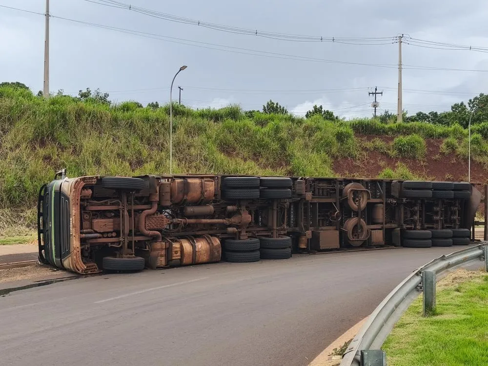 Um caminhão tombou na marginal da BR-163, em Marechal Cândido Rondon, no início da tarde de sexta-feira (14).