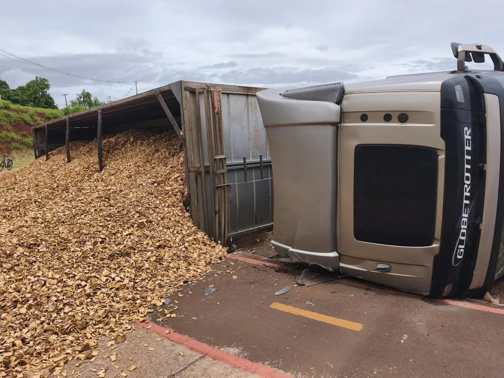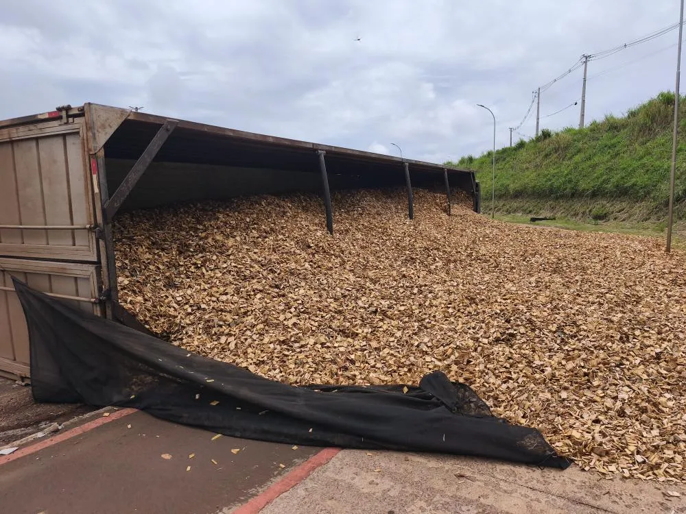 O motorista perdeu o controle da direção e o veículo acabou tombando às margens da rodovia. A carga de cavaco ficou espalhada pelo trecho.