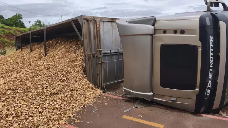 Um caminhão tombou na marginal da BR-163, em Marechal Cândido Rondon, no início da tarde de sexta-feira (14).