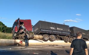 A carreta Scania perdeu o controle da direção e colidiu na mureta de proteção nas proximidades do portal de entrada da cidade. O bitrem subiu a mureta.