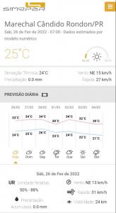 Para Marechal Cândido Rondon o Simepar não aponta previsão de chuva neste fim de semana. De hoje até segunda-feira (28) a previsão é de tempo nublado. Já para terça-feira (1°) o Simepar indica tempo nublado com probabilidade de pancadas de chuva.