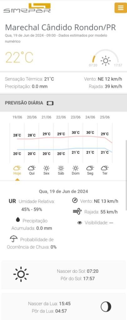 Confira a previsão do tempo para os próximos dias em Marechal Rondon, segundo o Simepar: