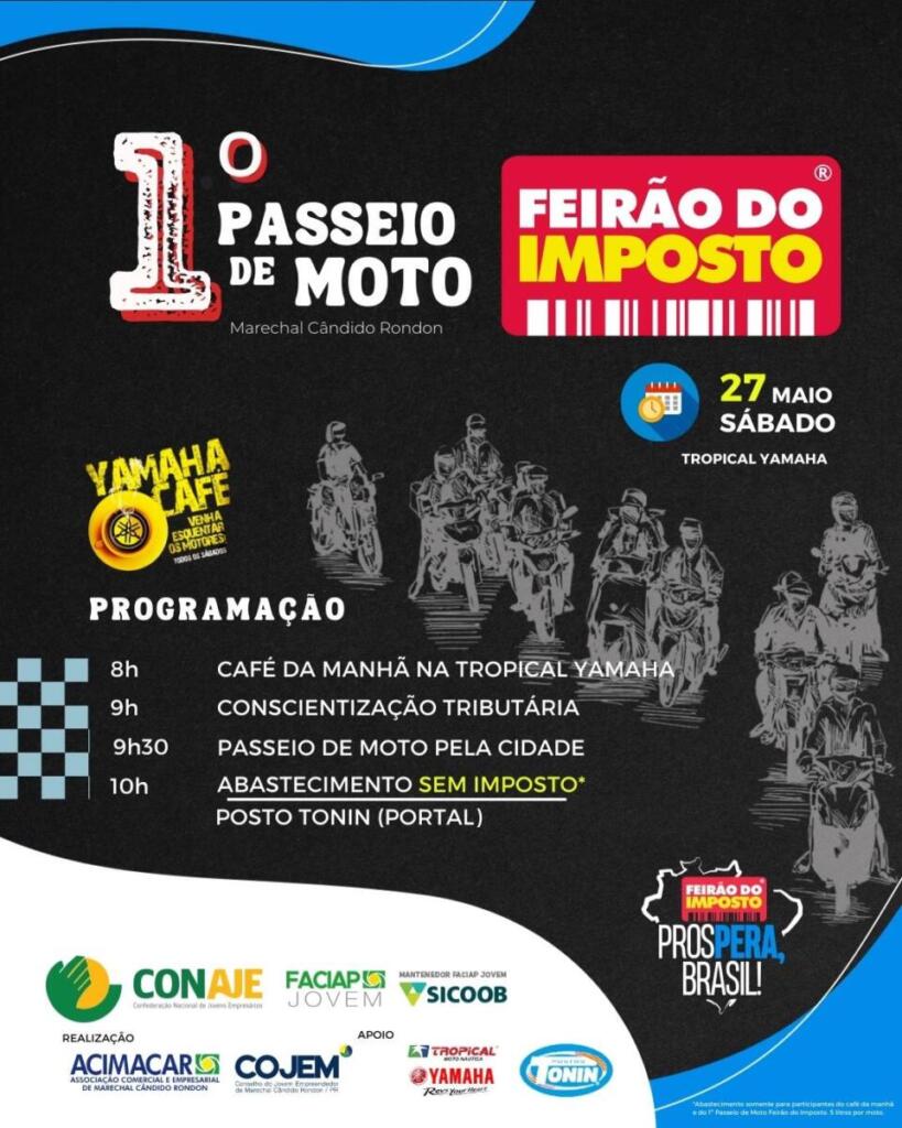 Neste sábado (27), o Cojem Marechal realiza em Marechal Rondon o Dia D do Feirão do Imposto, com uma série de atividades programadas em diversos locais da cidade. “Vamos promover uma ampla conscientização sobre a carga tributária e seus impactos na vida dos cidadãos. Será uma oportunidade para a população participar de ações práticas que visam informar e engajar a comunidade sobre a importância da eficiência na gestão do dinheiro público. O Dia D do Feirão do Imposto em Marechal Rondon promete ser um momento de reflexão e mobilização em busca de um sistema tributário mais justo e transparente”, ressalta a presidente do Cojem Marechal, Alana Ferreira.