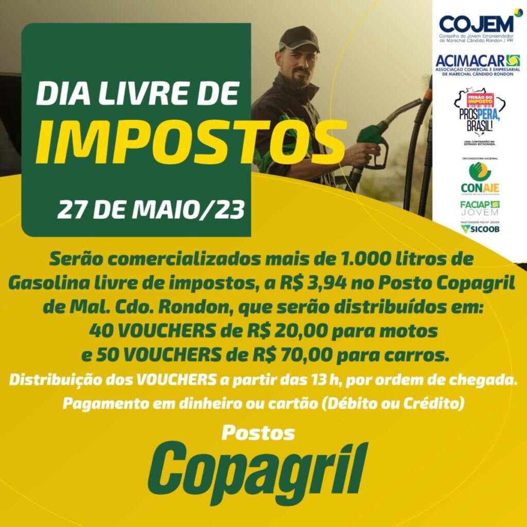 Uma das ações mais conhecidas é a venda de combustível com isenção de imposto, que em Marechal Rondon será realizado no Posto Tonin, localizado próximo ao portal da cidade, com abastecimento de 500 litros de combustível, distribuídos em vouchers de 5 litros exclusivamente para motos, com início a partir das 10 horas; e no Posto Copagril, serão 1000 litros de gasolina, com a venda de 40 vouchers de R$ 20 para motos e 50 vouchers de R$ 70 para carros. O abastecimento começa às 13 horas e o pagamento deve ser em dinheiro.