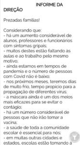 O diretor frisa diz que o uso da máscara não tem caráter obrigatório, é apenas uma orientação. “Temos uma aglomeração muito grande nas nossas dependências. Cerca de mil pessoas circulam diariamente pelos corredores, entre estudantes, professores, funcionários e os pais de alunos. Esta medida é uma precaução. Não é uma obrigação, mas é fortemente recomendada”, salienta.