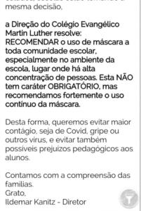 Após um aumento considerável de alunos, professores e colaboradores com sintomas gripais, o Colégio Evangélico Martin Luther, de Marechal Cândido Rondon, recomendou ontem (25), em comunicado aos pais, a volta do uso de máscaras no ambiente escolar. “Temos percebido no colégio, nos últimos dias, um aumento considerável de alunos, professores, funcionários e familiares com sintomas gripais, pessoas com Covid e com gripe, além de muitos alunos faltando, bem como professores e funcionários, porque estão doentes”, expõe o diretor Ildemar Kanitz.