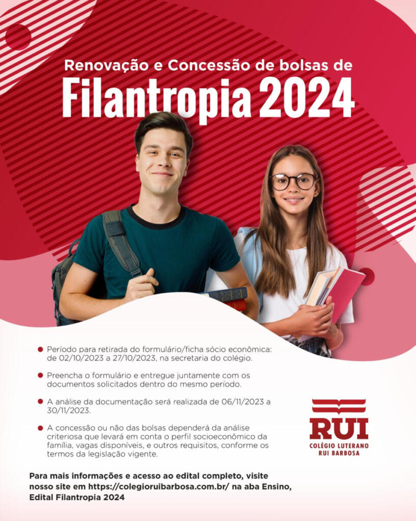 Lançado oficialmente no último dia 02, o processo de renovação e concessão de bolsas de filantropia do Colégio Luterano Rui Barbosa, de Marechal Cândido Rondon, para o ano letivo de 2024, tem o seu edital completo disponível no site da instituição (clique aqui), na aba Ensino, Edital Filantropia 2024.