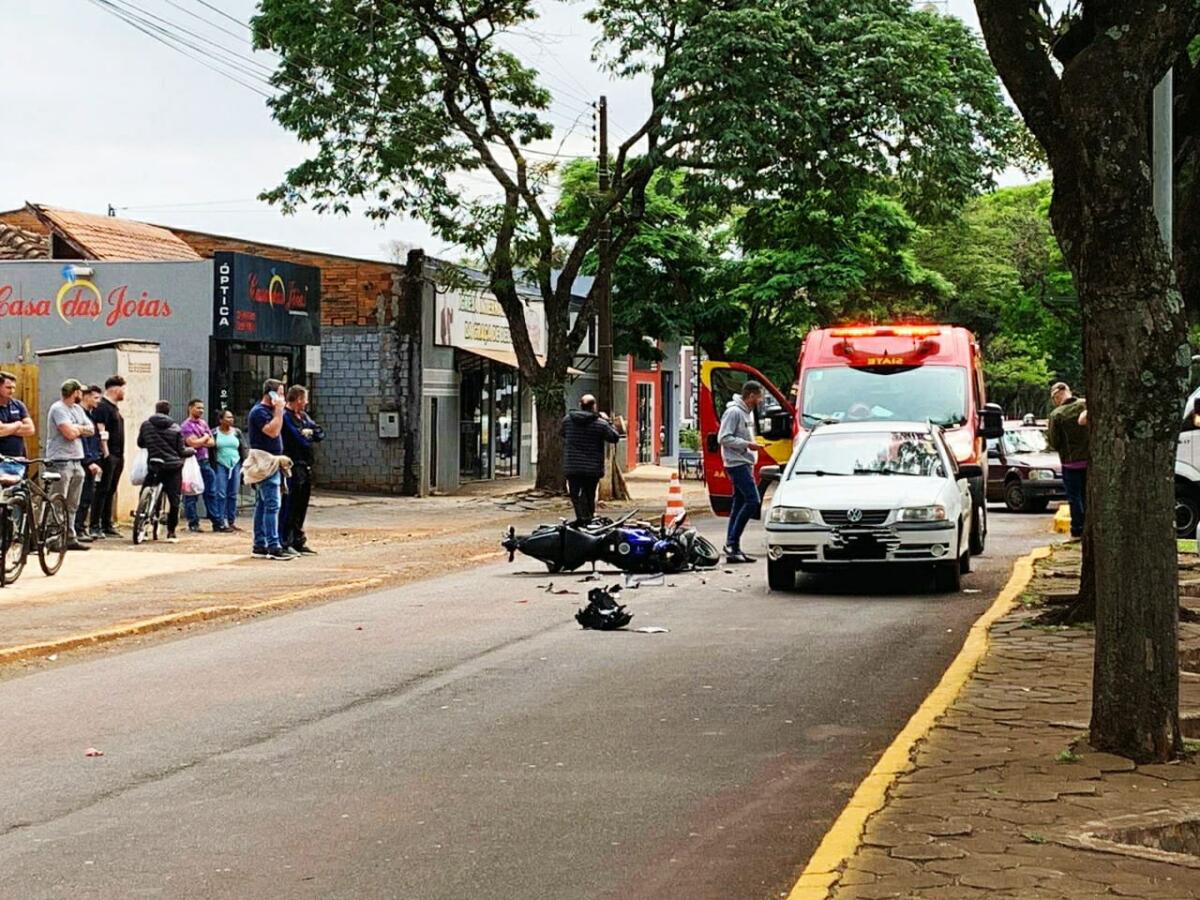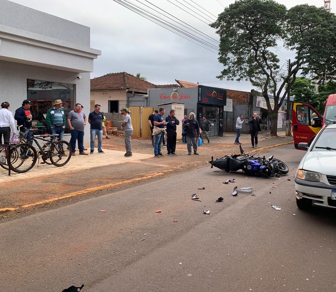 A colisão aconteceu na Avenida Maripá, próximo à Rua Rio de janeiro, e envolveu uma motocicleta e um automóvel.