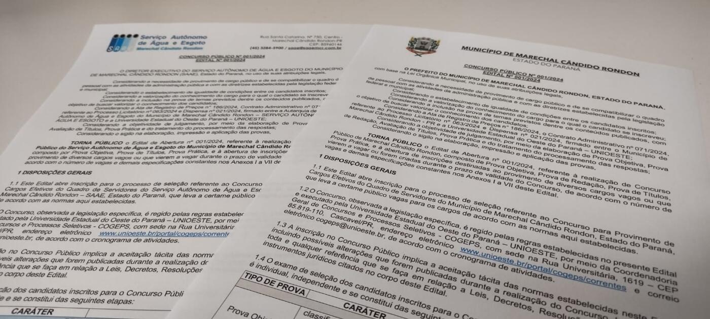 Estão abertas as inscrições dos concursos públicos realizados pela prefeitura de Marechal Cândido Rondon e pelo Serviço Autônomo de Água e Esgoto (SAAE). As inscrições seguem abertas até 6 de junho e devem ser realizadas exclusivamente através do site (clique aqui), mediante o preenchimento on-line de formulário. As provas objetivas estão marcadas para o dia 30 de junho.