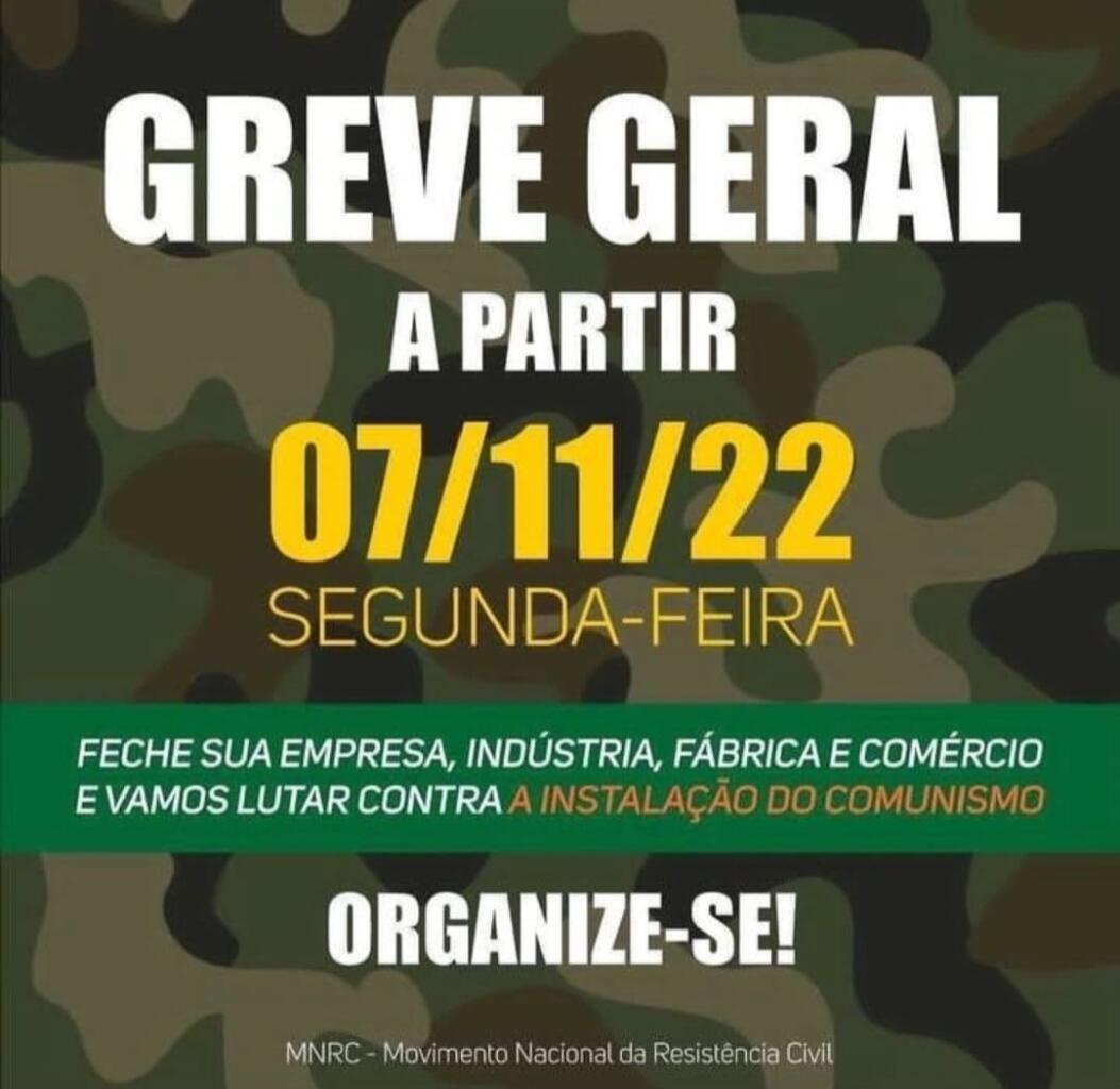 Uma greve geral tem sido convocada a partir desta segunda-feira (07) em todo o Brasil pelo Movimento Nacional de Resistência Civil (MNRC). Trata-se de uma manifestação pelo descontentamento diante do resultado do 2º turno das eleições, ocorrido no último dia 30.