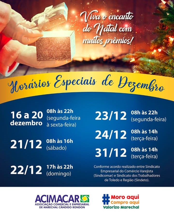 O comércio de Marechal Cândido Rondon está em clima natalino. E para facilitar as compras de final de ano, desde a segunda-feira (16) está atendendo em horário diferenciado, a fim de possibilitar que os consumidores busquem presentes e produtos para o Natal com maior tranquilidade.
