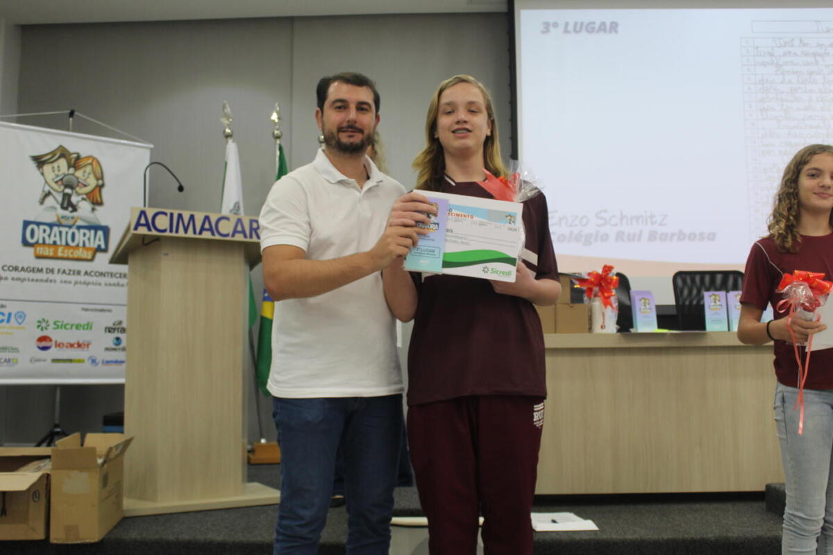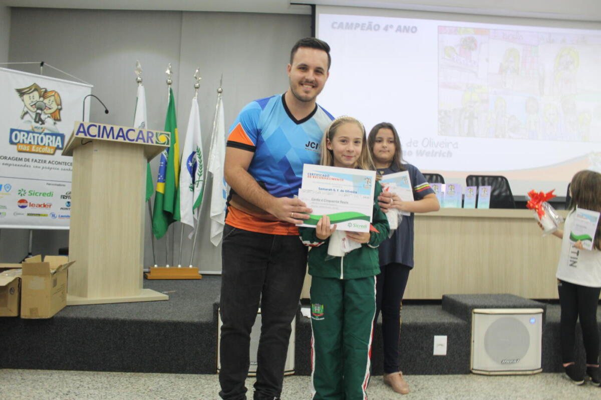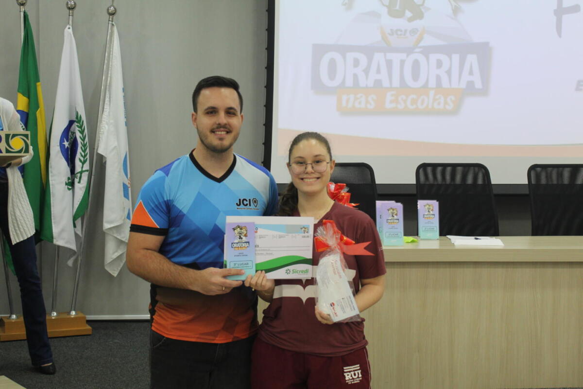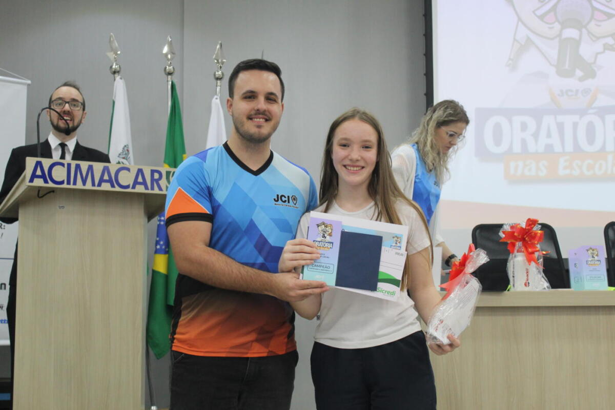 A campeã da oratória do Ensino Fundamental, Lara Bertoni Predolim, vai representar a JCI Marechal no concurso regional, que acontece em Cascavel entre os dias 13 e 14 de agosto. “Caso ela se sagre campeã, vai representar a JCI Marechal na convenção nacional, que vai acontecer em Marechal Rondon no mês de outubro”, informa Willian.