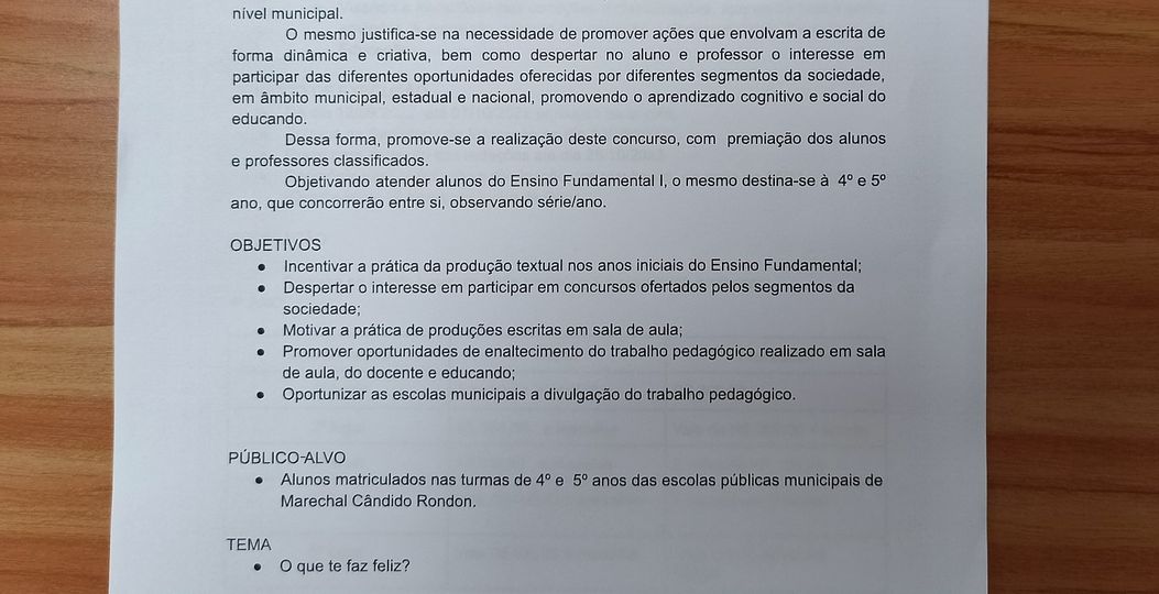Estimular a prática da escrita nos alunos da rede municipal de ensino. Com esta proposta, a Secretaria de Educação de Marechal Cândido Rondon promove o concurso de redação em nível municipal, tendo como tema: O que te faz feliz?