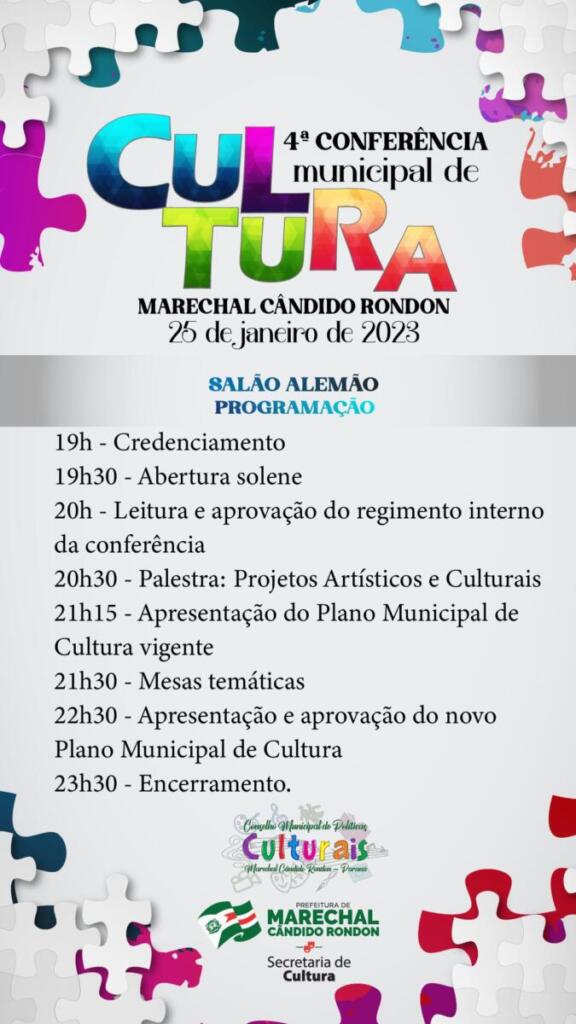 O Conselho Municipal de Políticas Culturais de Marechal Cândido Rondon e a prefeitura, através da Secretaria de Cultura, promovem a 4ª Conferência Municipal de Cultura na quarta-feira da semana que vem (25) no pavilhão alemão do Parque de Exposições.