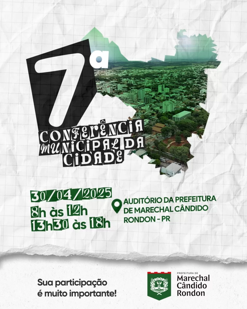 A prefeitura de Marechal Cândido Rondon promove, no dia 30 de abril, a Conferência Municipal da Cidade, um importante momento de diálogo entre o poder público e a sociedade civil sobre os rumos do desenvolvimento urbano local e nacional. O evento acontecerá no auditório da prefeitura, das 8 às 12 horas e das 13h30 às 18 horas.
