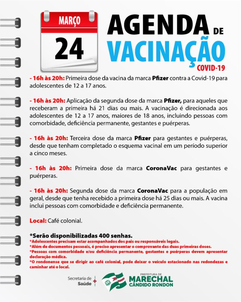 A Secretaria de Saúde segue com o cronograma de vacinação contra a Covid-19 na quinta-feira (24) em Marechal Cândido Rondon. A aplicação das vacinas acontecerá no Café Colonial, das 16 às 20 horas. Conforme a programação, há 400 senhas disponíveis.