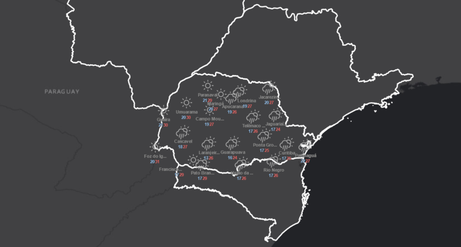Na segunda-feira (26) uma frente fria avança na altura do Sul do país, mas saindo mais pelo mar na altura da região, condição típica desta época do ano. Contudo, o tempo, que fica inicialmente mais abafado no Paraná, tem um aumento da instabilidade na região, com algumas chuvas e possibilidade de temporal localizado, neste início de semana.