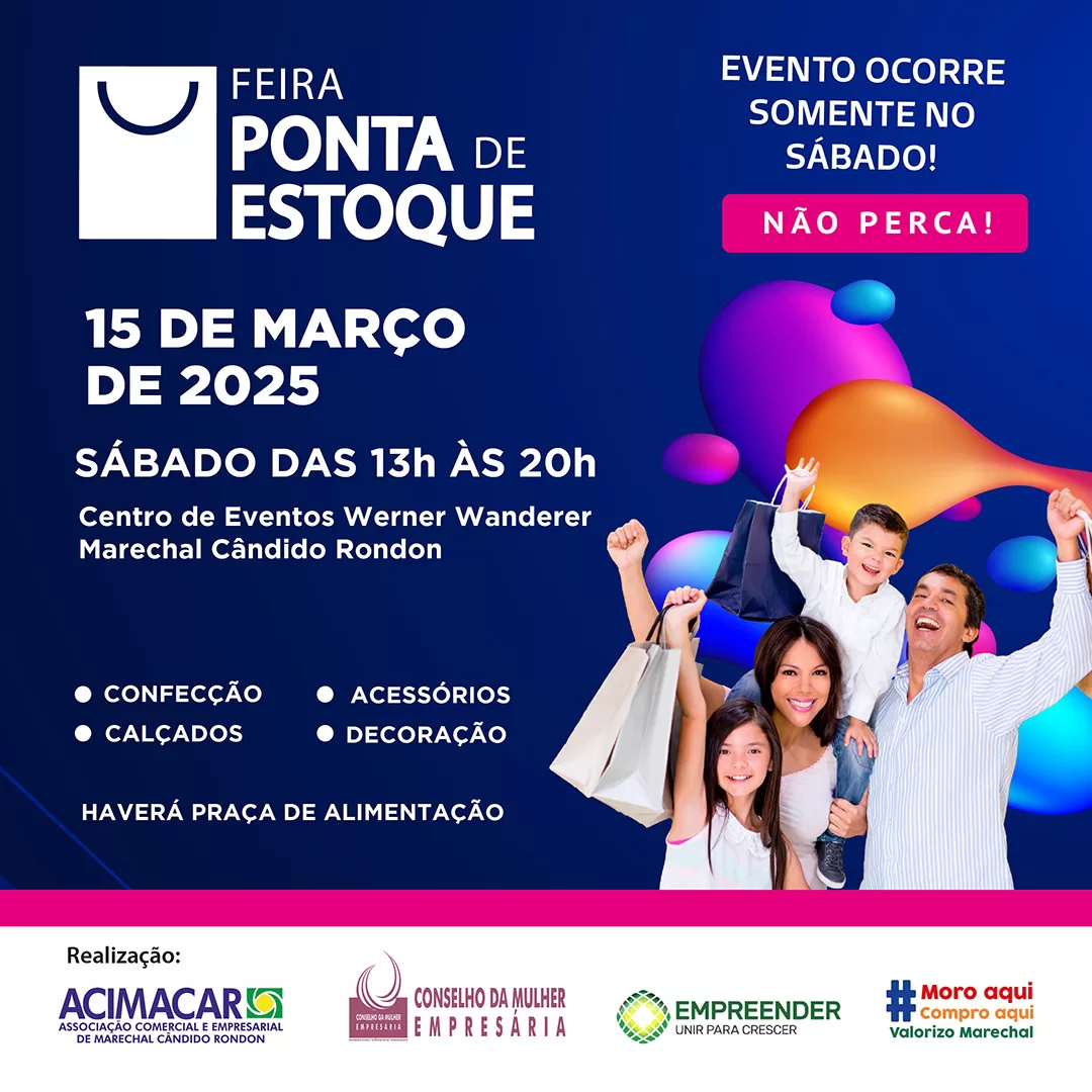 Organizada pelo Conselho da Mulher Empresária (CME) da Associação Comercial e Empresarial de Marechal Rondon (Acimacar), a Feira Ponta de Estoque oferece às empresas associadas uma excelente oportunidade para liquidarem seus produtos e renovarem os estoques com a troca de estação. Para os consumidores, é uma chance de adquirir produtos de qualidade a preços muito competitivos.