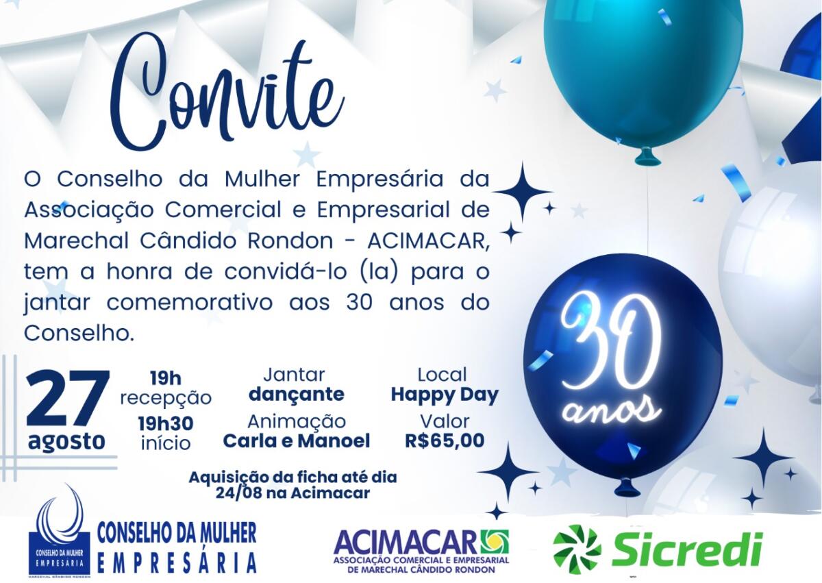 Em comemoração aos 30 anos de história, o Conselho da Mulher Empresária promove a partir das 19 horas deste sábado (27) um jantar dançante para celebrar a data. O evento será no espaço Happy Day.