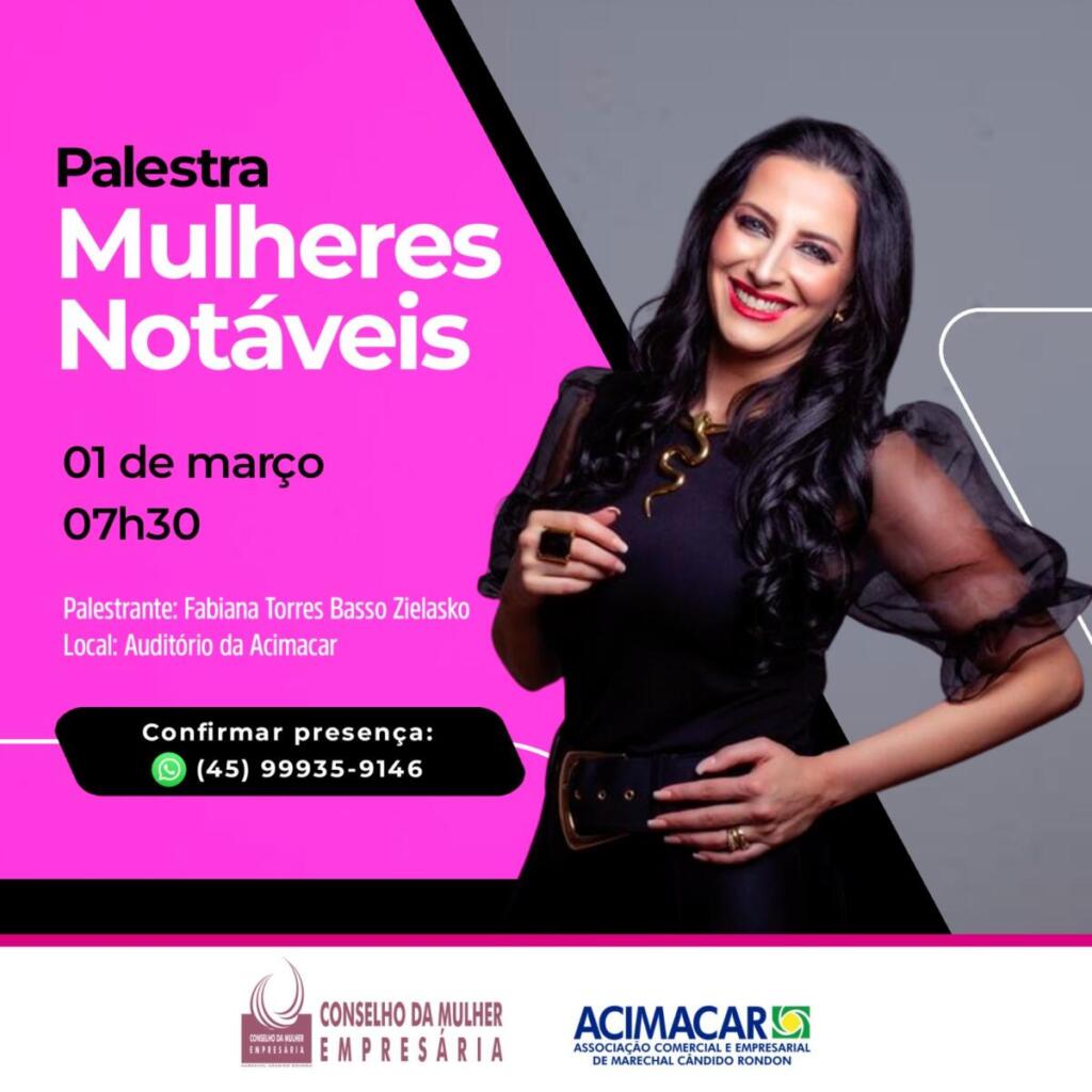 O Conselho da Mulher Empresária (CME), da Associação Comercial e Empresarial de Marechal Cândido Rondon (Acimacar) promove, nesta sexta-feira, dia 1º de março, a palestra gratuita “Mulheres Notáveis” em celebração ao Dia Internacional da Mulher, celebrado em 08 de março.