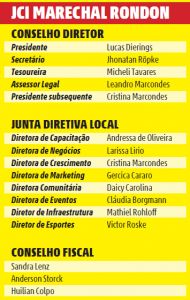 Cerimônia agendada para as 19h30 de sábado (20), marcará a posse dos dirigentes da JCI Marechal Cândido Rondon para o ano de 2021, além das transmissões de cargos na JCI Juvenil e no Clube do Senado JCI. O evento também contará com o ingresso de 16 membros nas fileiras da JCI. A posse dos dirigentes terá transmissão on-line em respeito aos decretos contra a Covid-19.