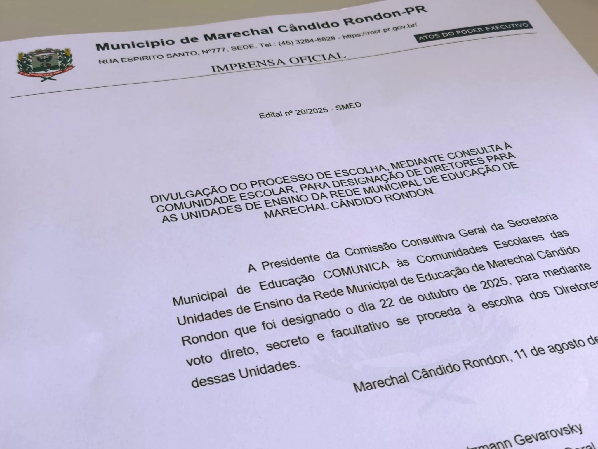 A Prefeitura de Marechal Cândido Rondon, por meio da Secretaria Municipal de Educação, divulgou nesta segunda-feira (11), via edital publicado no Diário Oficial Eletrônico, que a consulta à comunidade escolar para a designação de diretores das escolas municipais será realizada no dia 22 de outubro de 2025. A escolha ocorrerá por meio de voto direto, secreto e facultativo, envolvendo professores, pais, funcionários e demais membros das comunidades escolares de cada unidade.