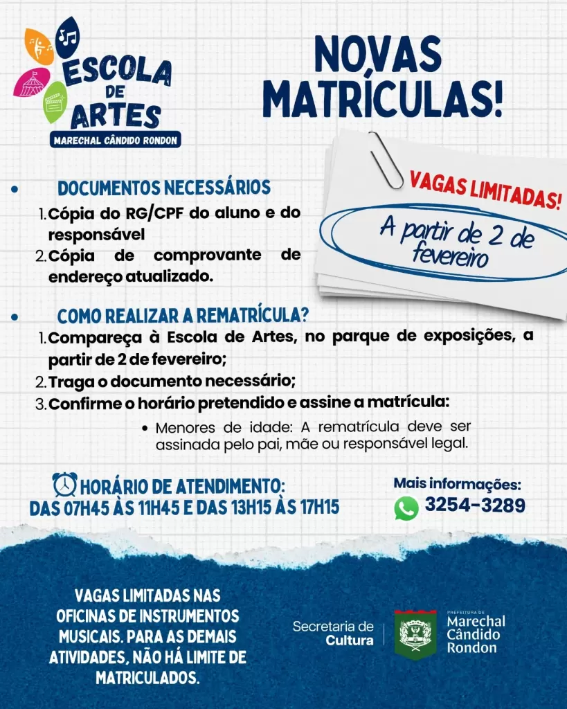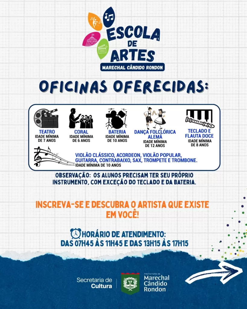 A prefeitura de Marechal Cândido Rondon, por meio da Secretaria Municipal de Cultura, informa que continuam abertas as matrículas para a Escola de Artes do município. As aulas têm início previsto para o dia nove de fevereiro, com vagas gratuitas e limitadas.