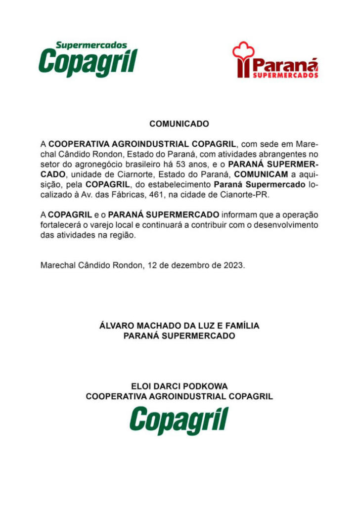 O Supermercado Paraná está em funcionamento em Cianorte desde o ano de 2014 e, a partir do mês de janeiro de 2024, passará a ser mais uma unidade do Supermercado Copagril.