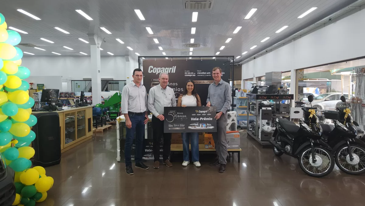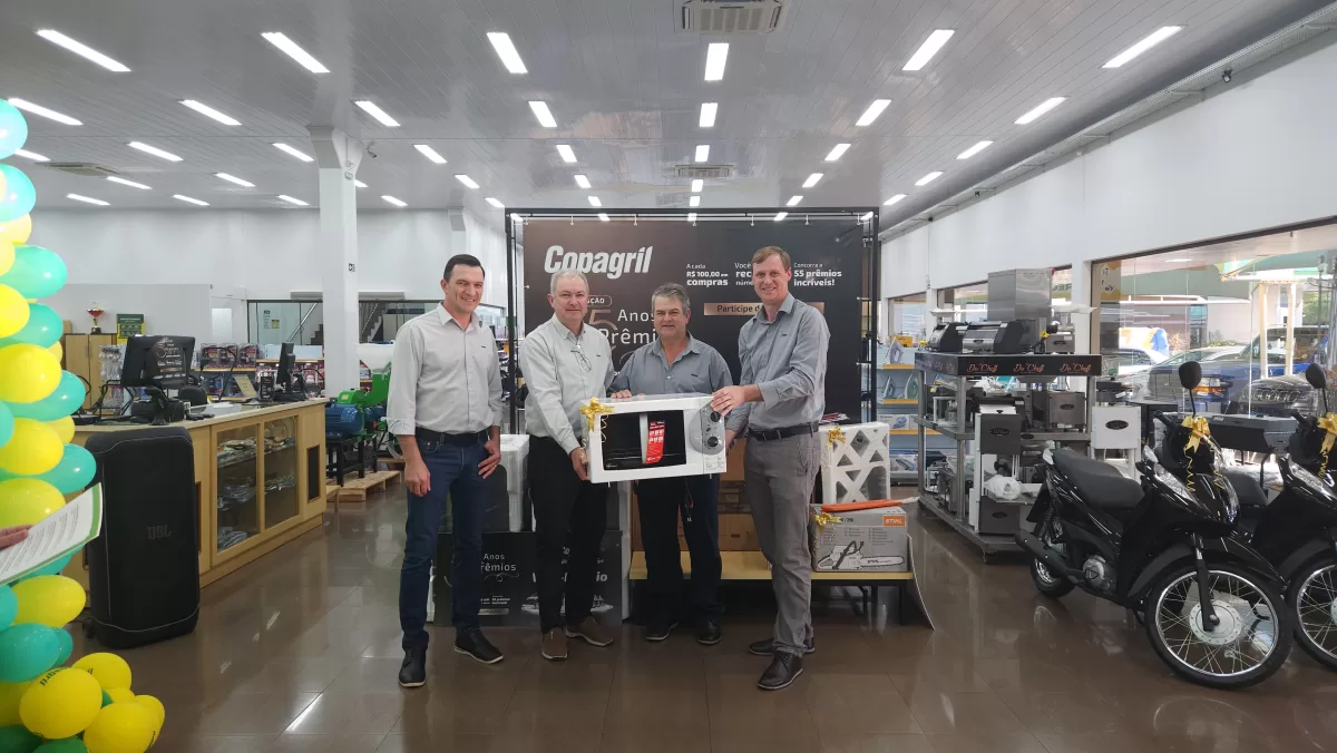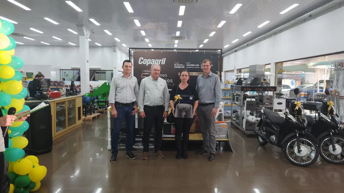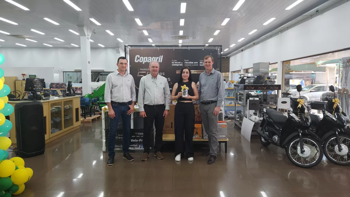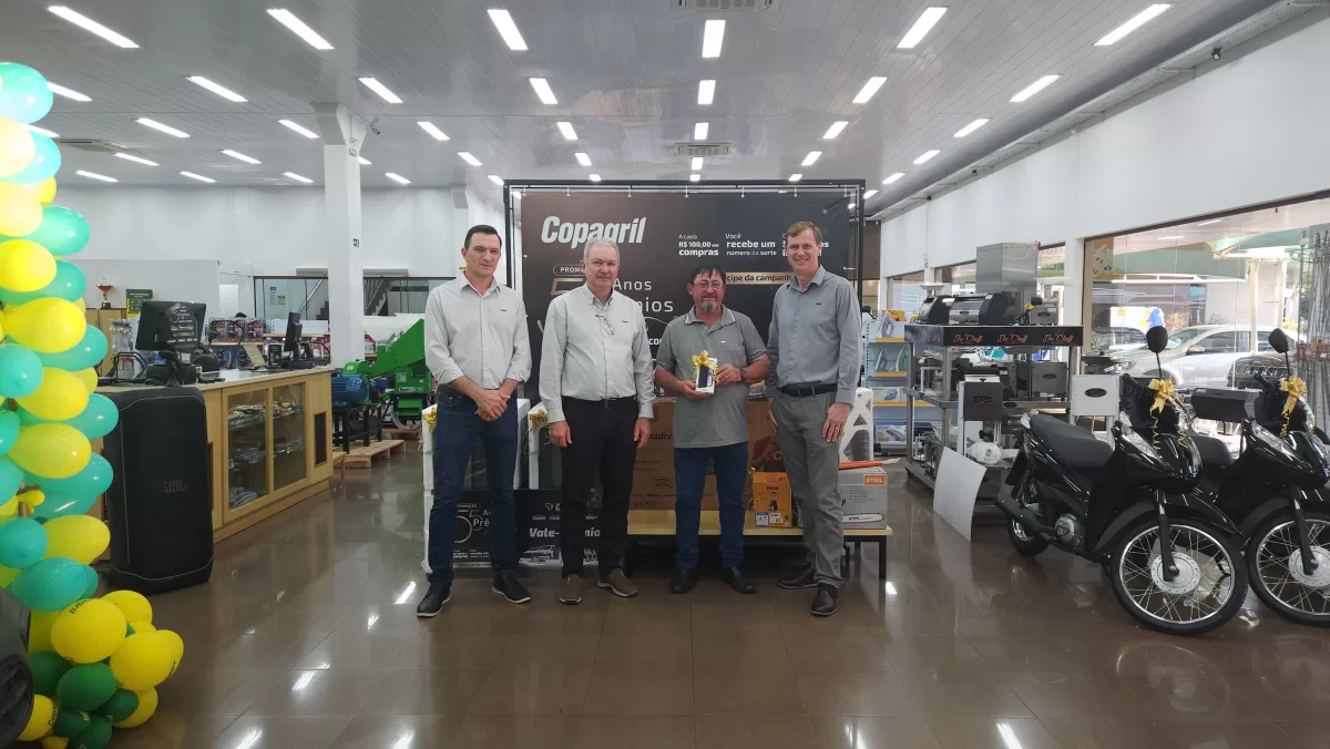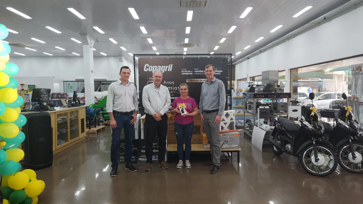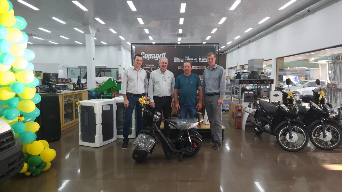O evento aconteceu na Loja Agropecuária Copagril, em Marechal Cândido Rondon-PR, reunindo o diretor-presidente Eloi Darci Podkowa, o diretor vice-presidente Cesar Luiz Petri, o diretor-secretário Ademir Luis Griep, além dos primeiros contemplados e convidados. Ao todo, 25 prêmios já foram distribuídos, entre motocicletas, motos elétricas, vales-compras, eletrodomésticos e kits práticos para o dia a dia.