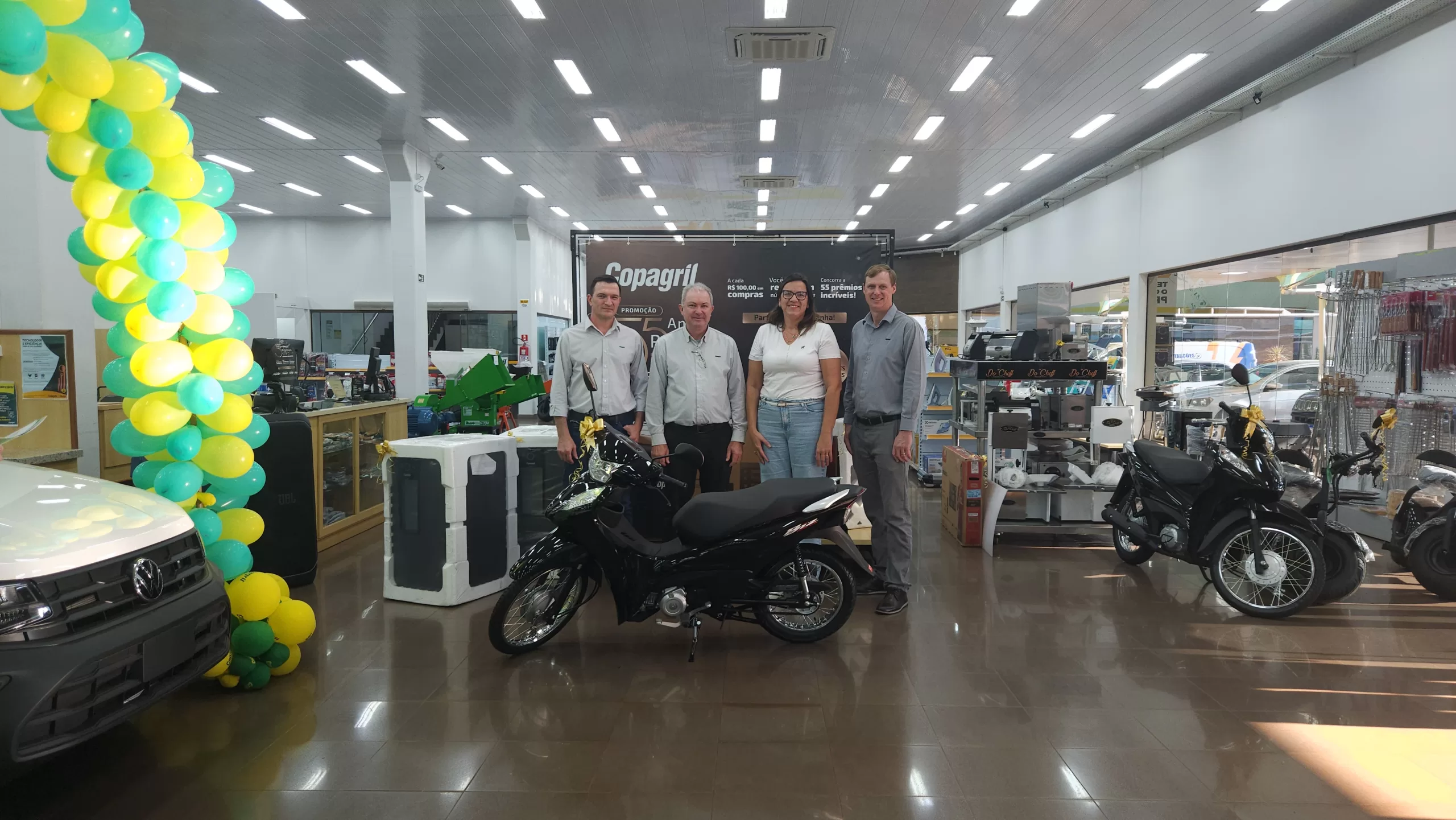 O evento aconteceu na Loja Agropecuária Copagril, em Marechal Cândido Rondon-PR, reunindo o diretor-presidente Eloi Darci Podkowa, o diretor vice-presidente Cesar Luiz Petri, o diretor-secretário Ademir Luis Griep, além dos primeiros contemplados e convidados. Ao todo, 25 prêmios já foram distribuídos, entre motocicletas, motos elétricas, vales-compras, eletrodomésticos e kits práticos para o dia a dia.